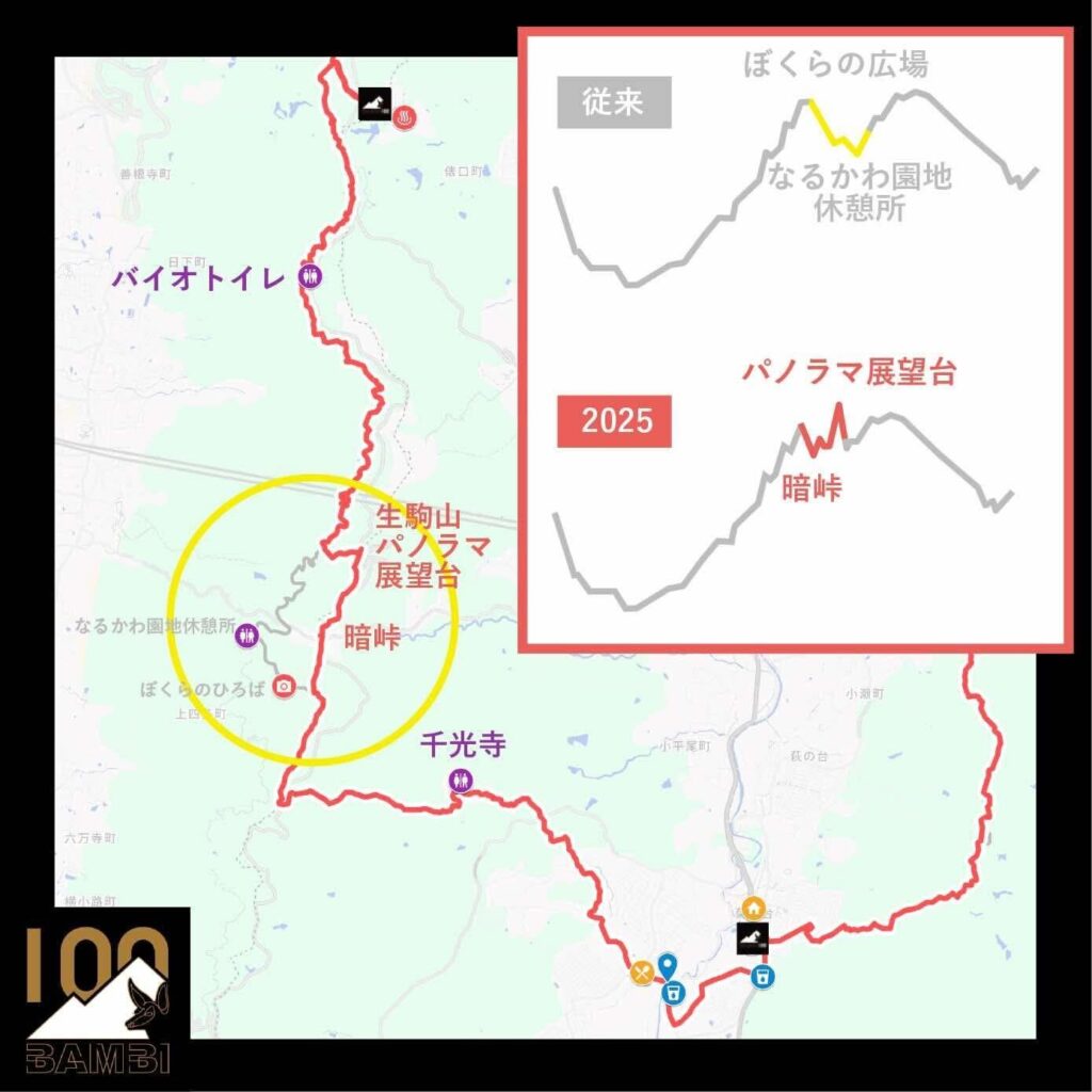 BAMBI100開催期間中、「ぼくらの広場」周辺ではトイレ改修工事などが行われており、関係各所との調整の結果、今回は立ち寄らないルートでの実施となりました。