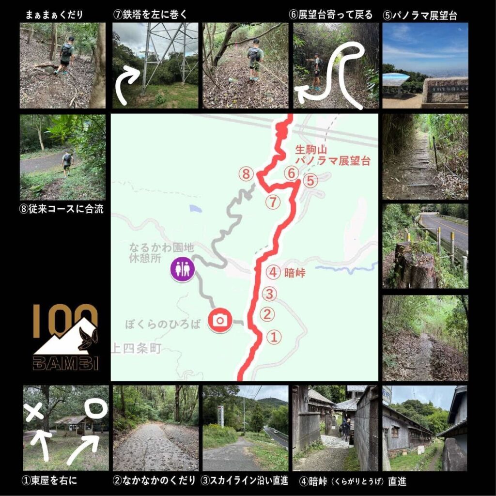 これに伴い、「ぼくらの広場」を経由するルートから、「パノラマ展望台」で景色を楽しむコースへ一部変更となります。過去のルートとは異なりますので、鳴川峠から「ぼくらの広場」方面へ向かう分岐では特にご注意ください。詳細はGPXデータおよび写真をご確認ください。